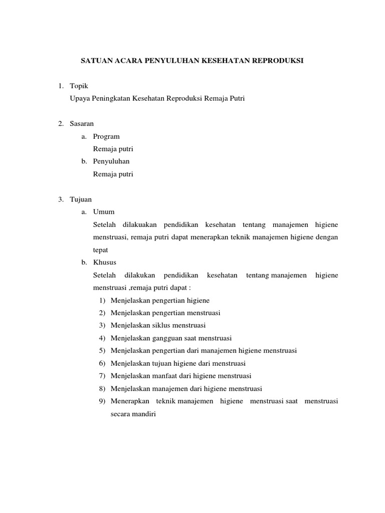 Satuan acara penyuluhan sap kesehatan reproduksi remaja. Tujuan umum remaja mempunyai prilaku seksual yang sehat dan mampu menjaga kesehatan reproduksinya. Kurangnya edukasi terhadap hal yang berkaitan dengan reproduksi nyatanya bisa memicu terjadinya hal hal yang tak diinginkan. Jadi dengan melakukan. Arum tri hirasiana damayanti. Di era globalisasi ini masih banyak remaja yang kurang memperhatikan kesehatan dan kebersihan alat reproduksi mereka bahkan para remaja sekarang jauh lebih mementingkan penampilan luar wajah dan cara berpakaian daripada kesehatan alat reproduksi mereka yang dapat menentukan masa depan mereka terutama setelah menikah.