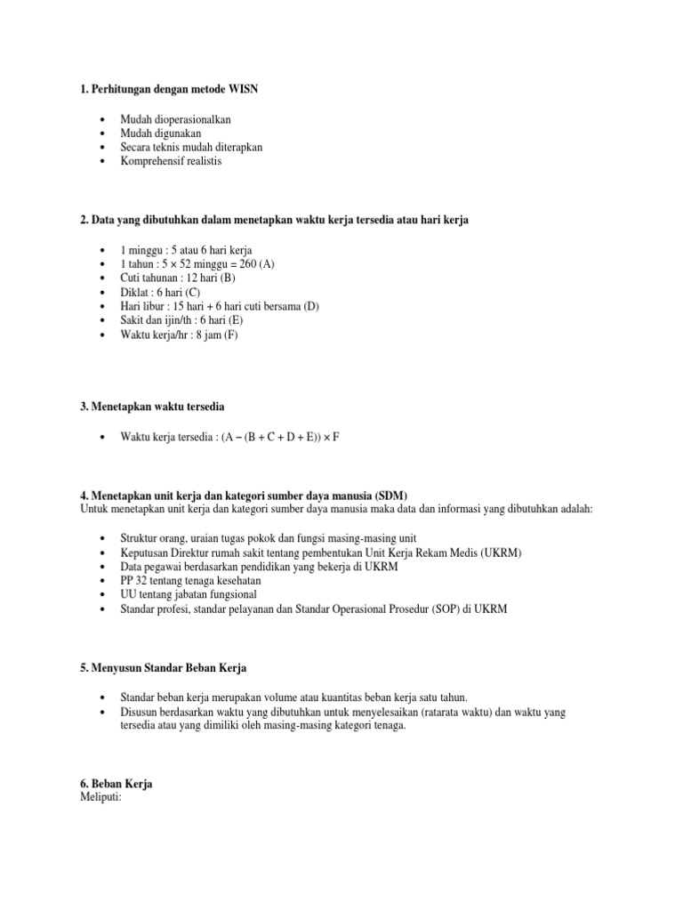 Contoh perhitungan metode wisn. Perhitungan jumlah tenaga perawat. Pada kenyataannya di bagian koding indeksing rawat inap terdapat 2 petugas karena 1 petugas di khususkan untuk dokumen jamkesmas. Administrasi tanpa melalui proses perhitungan kebutuhan tenaga kesehatan berdasarkan kepmenpan atau pun wisn. Academiaedu is a platform for academics to share research papers. Maka dari itu jika terjadi kesalahan perhitungan di satu langkah akan berdampak pada hasil perhitungan langkah berikutnya khoiri et al. 6 hari kerja x 50 minggu 300 hari.