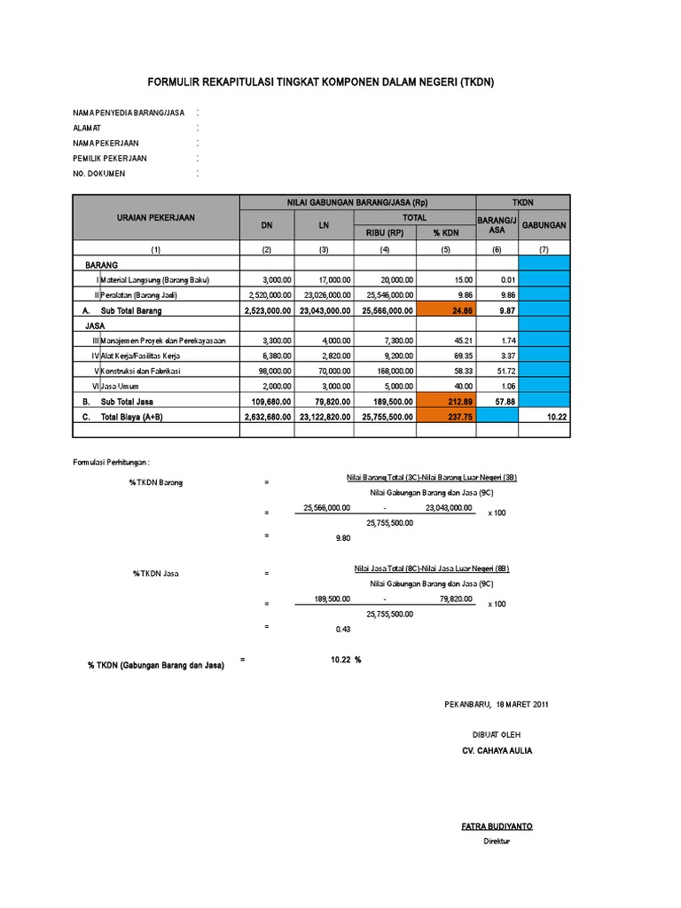 Itu pake excel 2010 pak xlsx. Xyz dengan tkdn 40 c. Simulasi perhitungan tingkat komponen dalam negeri gabungan barang dan jasa peserta lelang dengan lingkup pengeboran lepas pantai material yang digunakan import ton pt. 7 metode pelaksanaan pekerjaan atap baja ringan. Sebagai contoh pada produk komputer merek a yang diproduksi di dalam negeri hanya casing dan power supply nya. At pengadaan barang dan jasa.