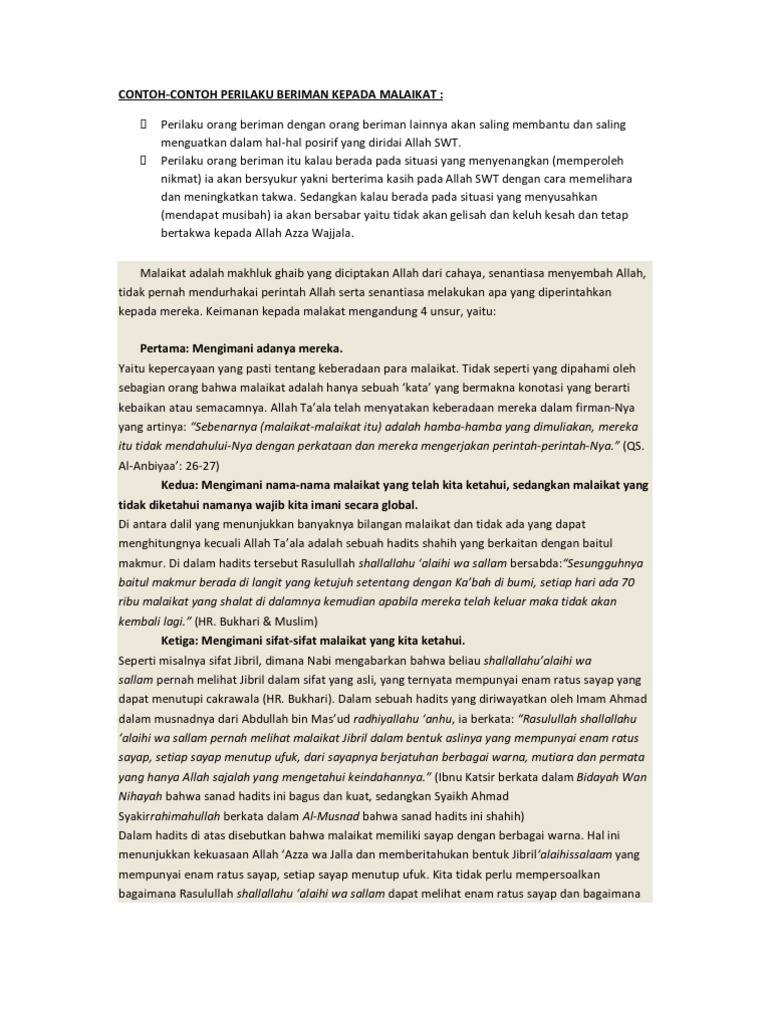 Contoh perilaku beriman kepada malaikat jibril. Sebagai muslim yang memiliki iman kepada malaikat seseorang akan menunjukkan beberapa perilaku yang mengindikasikan dari rasa keimanannya itu sendiri. Dari cahaya tunduk dan patuh yang diberi tugas untuk melaksanakan perintah nya yakni mengurus alam semesta ini. Iman kepada malaikat jibril. Jika seseorang telah beriman kepada rukun islam kedua ini akan terdapat contoh perilaku yang mencerminkan dirinya beriman kepada malaikat allah. Contoh contoh perilaku beriman kepada malaikat berkata jujur menepati janji dan menjaga amanah. Perilaku pertama yang paling jelas terlihat dari keimanan seseorang kepada malaikat adalah taat pada setiap perintah allah swt dan rasul.