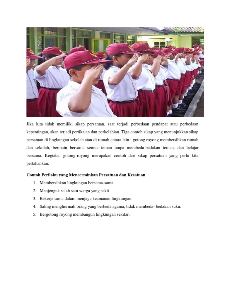 Beberapa contoh kegiatan yang mencerminkan persatuan dan kesatuan dalam keluarga antara lain. Contoh kegiatan yang mencerminkan persatuan dan kesatuan di lingkungan sekolah pada kesempatan yang baik ini kita akan belajar tentang contoh persatuan dan kesatuan dilingkungan sekolahsemangat persatuan dalam bernegara merupakan pengikat suatu negara untuk dapat berdiri tegak selama lamanya. Dengan adanya persatuan masyarakat yang datang dari berbagai latar belakang berbeda seperti agama suku kebudayaan kepercayaan ras bahasa dan sebagainya bisa hidup rukun dan damai. 10 contoh sikap menunjukkan persatuan dan kesatuan juga yang tidak. Bukan juga berarti bahwa orang tua yang seorang dokter harus mempunyai anka seorang doketer juga. Contoh perilaku yang mencerminkan persatuan dan kesatuan.