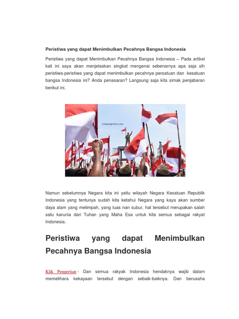 Peristiwa yang dapat menimbulkan pecahnya persatuan negara indonesia lengkap gadisnet. Peristiwa ini menjadi konflik paling mencekam dan tragis. Kemudian berikanlah komentar atau pendapat kalian. Namun untuk mengatasi hal tersebut sebagai warga indonesia yang baik kita sepatutnya dapat mengembangkan sikap toleransi dan saling menghormati antar agama suku ras maupun antar golongan. 0 response to peristiwa yang dapat menimbulkan pecahnya persatuan negara indonesia lengkap post a comment. Nama peristiwa penyebab peristiwa yang dapat menimbulkan pecahnya persatuan bangsa indonesia.