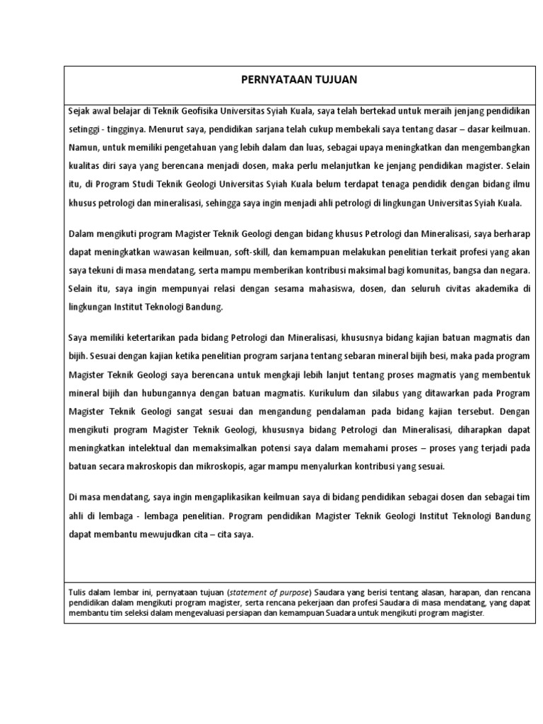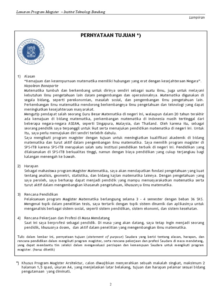 Contoh pernyataan tujuan s2 itb. Sebelumnya perhatikan intruksi yang diberikan oleh setiap panitia penerimaan dari pihak kampus yang dituju. Kebetulan saya sekarang sedang kuliah s2 di informatika itb. Pernyataan tujuan statement of purpose bukti pelunasan biaya pelaksanaan seleksi mahasiswa pascasarjana itb. Berencana menapaki jenjang pendidikan magister sudah saya jadikan agenda hidup bahkan sebelum saya belajar di teknik geofisika itb. Pernyataan tujuan mengikuti jenjang s2 itb. Untuk poin sertifikat bahasa inggristpa yang belum ada masih bisa ditunda sampai proses pengumaman hasil seleksi.