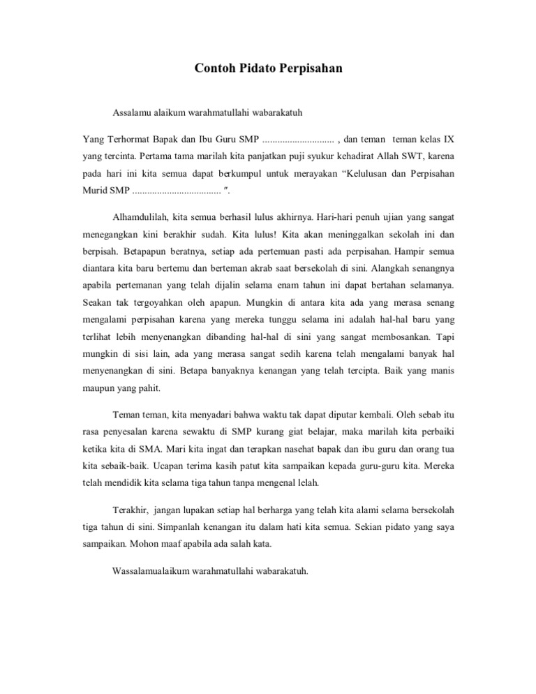Pidato perpisahan sekolah sekolahpidato perpisahan sekolah adalah kata sambutan yang berisikan tentang ucapan perpisahan yang disampaikan oleh siswa alumni kepada gurunya. Orang yang berpidato disebut orator. Kepada yang terhormat bapak kepaka sekolah dan seluruh rekan rekan guru dari smpn 3 atas nama keluarga besar smpn 3 saya ingin mengucapkan permohonan maaf bila saya melakukan kesalahan kesalahan. Bapak dan ibu guru serta teman teman yang saya cintai. Pertama tama marilah kita panjatkan puji syukur kehadirat tuhan yang maha esa karena atas segala rahmat nya. Contoh pidato perpisahan guru.
