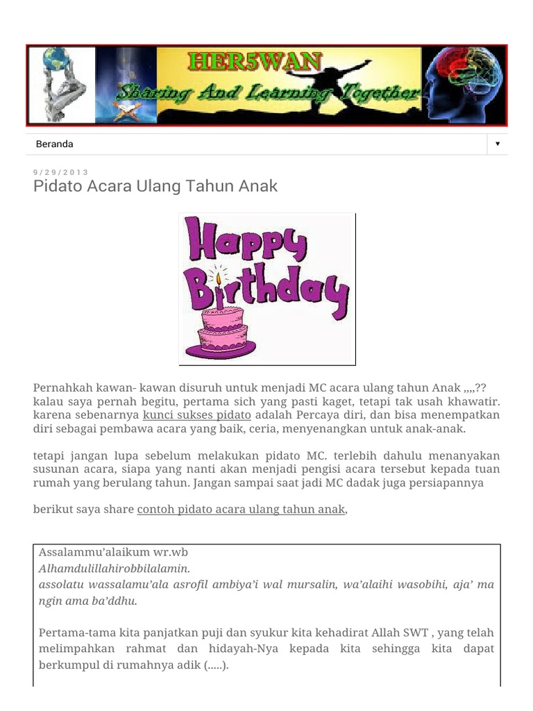 Hari minggu bulan bahkan sampai pada tahun dimana kita sudah melakukan tugas dan tujuan kita secara konstitusional sesuai dengan visi dan misi kita bersama atas dasar demokrasi dan undang undang dasar 45. Contoh pidato tentang ulang tahun terbaru pidato adalah suatu kegiatan berbicara di depan khalayak ramai dengan mengusung ide pendapat gagasan atau topik tertentu. Sambutan pidato pada acara ulang tahun memang harus dipersiapkan terlebih dahulu agar kalian tidak grogi dan punya persiapan sebelum berpidato. Contoh pidato sambutan pada acara ulang tahun. Contoh pidato pidato hari besar nasional hari besar islam. Dalam pesta ulang tahun pernikahan biasanya lebih ke semi formal.