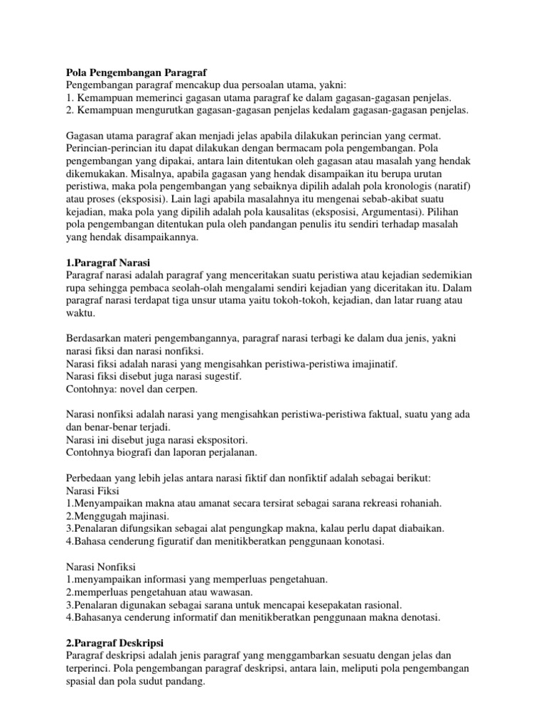 Contoh pola pengembangan paragraf. Supaya lebih paham bentuk pola tersebut ketika ditulis ke dalam paragraf berikut beberapa contoh pola pengembangan dalam bahasa indonesia. Paragraf ini sendiri termasuk ke dalam salah satu jenis jenis paragraf berdasarkan isinya selain paragraf argumentasi paragraf deskripsi paragraf narasi serta contoh kalimat dan paragraf persuasi. Contoh pola analisis korupsi kolusi dan nepotisme kkn terus menjamur di indonesia. Jenis jenis pola pengembangan paragraf yang disebutkan di atas akan sedikit kami uraiakan di uraian di bawah ini. Contoh pola pengembangan paragraf klimaks dan anti klimaks. Pola pola tersebut nantinya akan membentuk jenis jenis paragraf berdasarkan pola pengembangannya.