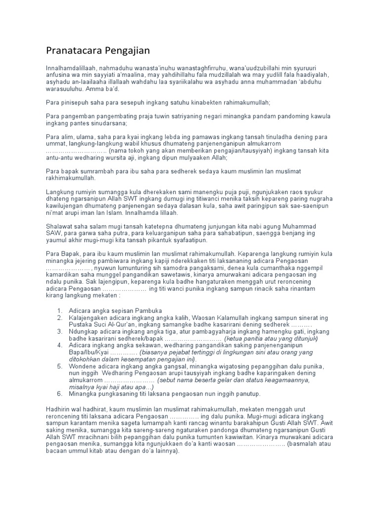 Contoh pranatacara bahasa jawa pengajian. Contoh teks naskah untuk mc atau pembawa acara pengajian dalam bahasa jawa materi ini saya posting sebagai pengalaman saya untuk mempersiapkan materi ketika menjadi mc atau pembawa acara dalam pengajian dalam rangka menyambut bulan suci romadhan. Itulah yang dapat kami bagikan terkait contoh teks pranatacara bahasa jawa singkat. Mugiya kawilujengan lan kasarasan saking ngarsa dalem gusti alloh t. 2contoh teks pranatacara bahasa jawa acara pengajian assalaamualaikum warahmatullaahi wabarakaatuhu innalhamdalillaah nahmaduhu wanastainuhu wanastaghfirruhu wanauudzubillahi min syuruuri anfusina wa min sayyiati amaalina may yahdihillahu fala mudzillalah wa may yudlill fala haadiyalah asyhadu an laailaaha illallaah wahdahu laa syariikalahu wa asyhadu anna muhammadan. Pada kesempatan kali ini kami akan memberikan contoh contoh teks mc pengajian bahasa jawa yang bisa bisa anda jadikan referensi sebelum melakukan pidato. Contoh pranatacara perpisahan pranatacara perp i sahan sma n 1 wates assalamu alaikum wr.