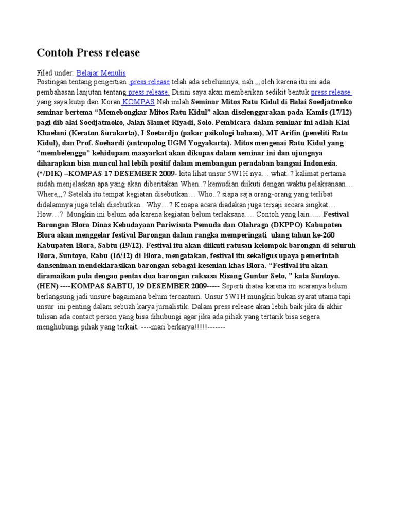 Contoh press release pengertian press realese adalah suatu cara yang digunakan praktisi untuk menyampaikan informasi baik itu berupa kegiatan kebijakan klarifikasi ataupun acara yang dilakukan oleh perusahaan atau organisasi melalui media massa atau website perusahaan. Melalui teknik penulisan press release yang sederhana ini kita akan sama sama mempelajari apa saja yang perlu kamu lakukan sebelum ketika dan setelah membuat press release.