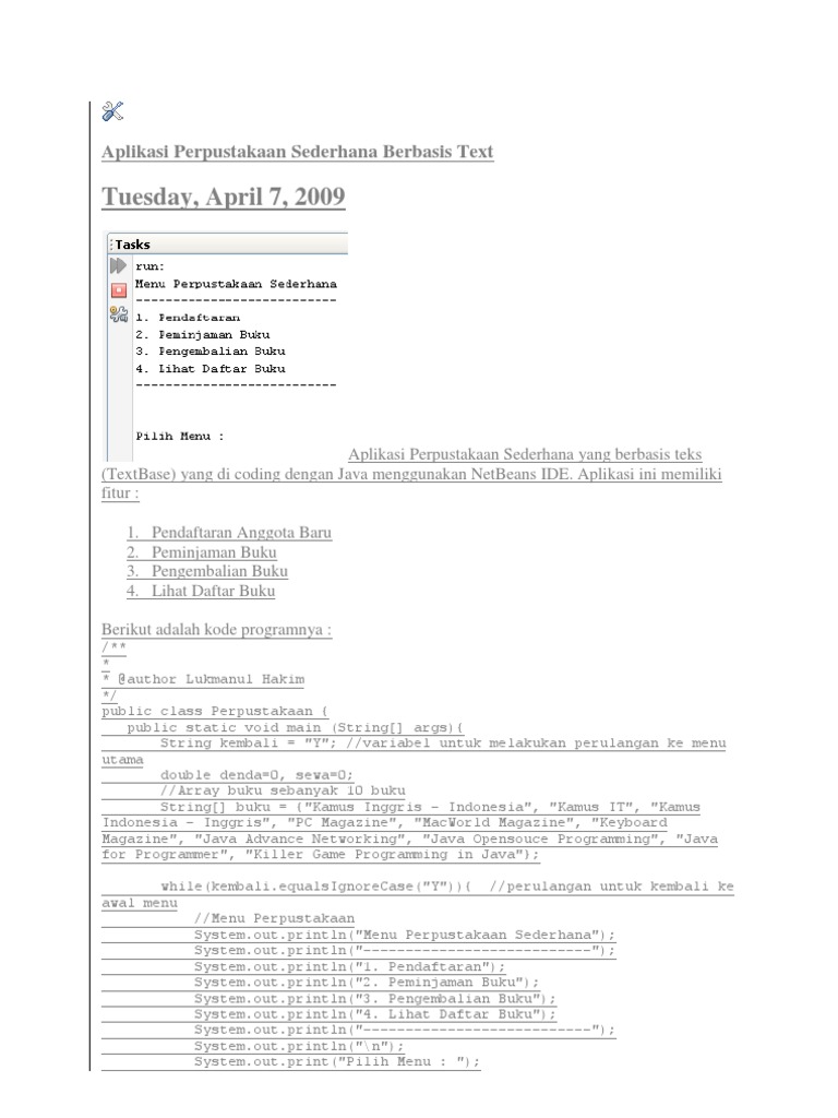 Contoh sederhana percabangan switch case dalam program java. Contoh program perpustakaan sederhana dengan netbeans oleh. J man 87792 views. Contoh program perpustakaan sederhana java netbeans tugas mandiri 2. Public class contohpercabanganswitch public static void main string args char grade a. Dan untuk melihat cara menggunakannya silahkan lihat videonya disini.