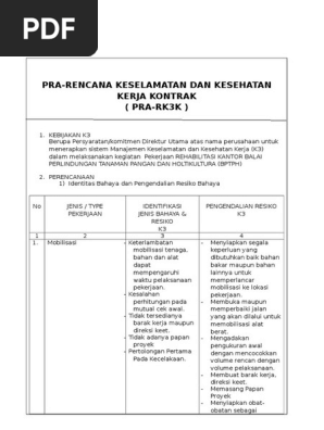 Adapun isi dari k3 dalam pelelangan adalah. Pra rk3k pekerjaan bangunan gedung. Contoh pra rk3k pekerjaan jalan pra rk3k pekerjaan jalan salah satu aspek penentu dalam mengikuti lelang baik yang melalui e proc atau non e proc adalah pembuatan rencana k3. Dalam waktu 7 tujuh hari setelah penandatanganan kontrak penyedia jasa melaksanakan rapat pra pelaksanaan pre construction meetingpcm yang dihadiri pemilik direksi pekerjaan direksi teknis dan penyedia jasa untuk membahas semua hal baik teknis maupun non teknis dalam proyek ini.