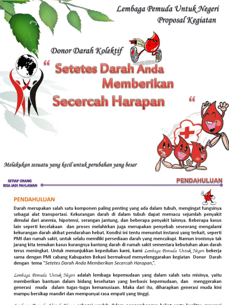 Contoh proposal donor darah. Contoh proposal donor darah proposal. Contoh proposal kegiatan kampus terbaru. Kegiatan donor darah akan membatu masyarakat yang mebutuhkan karena belum tentu tersedia darah di pmi palang merah indonesia untuk semua jenis golongan darah. Proposal donor darah ini kami bagikan dalam format doc. Proposal kegiatan sosial donor darah. Dan setiap beberapa waktu ada pula penggalangan penyumbangan darah yang diadakan di tempat tempat keramaian seperti di pusat perbelanjaan kantor perusahaan besar tempat ibadah serta sekolah dan universitas secara sukarelapada acara ini para calon penyumbang dapat menyempatkan.
