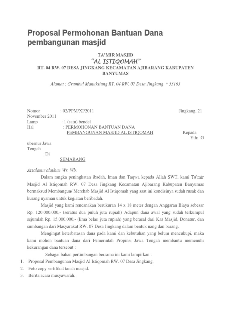 Apabila terdapat kesamaan nama alamat dan gelar kami mohon maaf yang sebesar besarnya. Academiaedu is a platform for academics to share research papers. Sedekah jariah termasuk membangun masjid ilmu yang bermanfaat dan anak yang shaleh yang mendoakan kedua orang tuanya r. 1 satu set perihal. Bersama ini kami sampaikan proposal singkat ke hadapan bapak dan ibu dengan maksud sebagai media untuk menjelaskan rencana pembangunan masjid nurul iman jalan raya tenang desa berasang kecamatan kisam tinggi kabupaten oku selatan yang juga akan berfungsi sebagai pusat sarana ibadah dan pembinaan ke islaman di lingkungan masyarakat sekitar. Contoh proposalnya bagus dan lengkap mohon izin untuk copas sebagai contoh rencana pembangunan masjid di sekolah kami.
