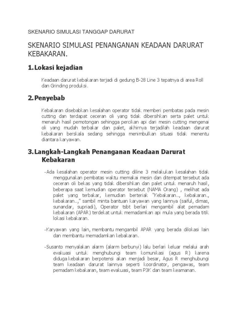 Contoh prosedur tanggap darurat kebakaran. 72 tugas dan tanggung jawab organisasi tanggap darurat. Segera menuju tangga darurat yang terdekat dengan berjalan biasa dengan cepat namun tidak berlari. Memastikan prosedur keadaan darurat dipatuhi dan dilaksanakan. 38 rencana tindak darurat kebakaran suatu rencana atau plan yang memuat prosedur yang mengatur siapa harus berbuat apa pada saat terjadi keadaan darurat dalam satu bangunan gedung dalam hal ini kebakaran dimana tiap bangunan akan berbeda bentuk rtdk nya sesuai dengan situasi dan kondisi masing masing. Definisi unit tanggap darurat ialah unit kerja yang dibentuk secara khusus untuk menanggulangi keadaaan darurat di tempat kerja. Melakukan inspeksi terhadap perlengkapan keadaan darurat tersebut secara berkala.
