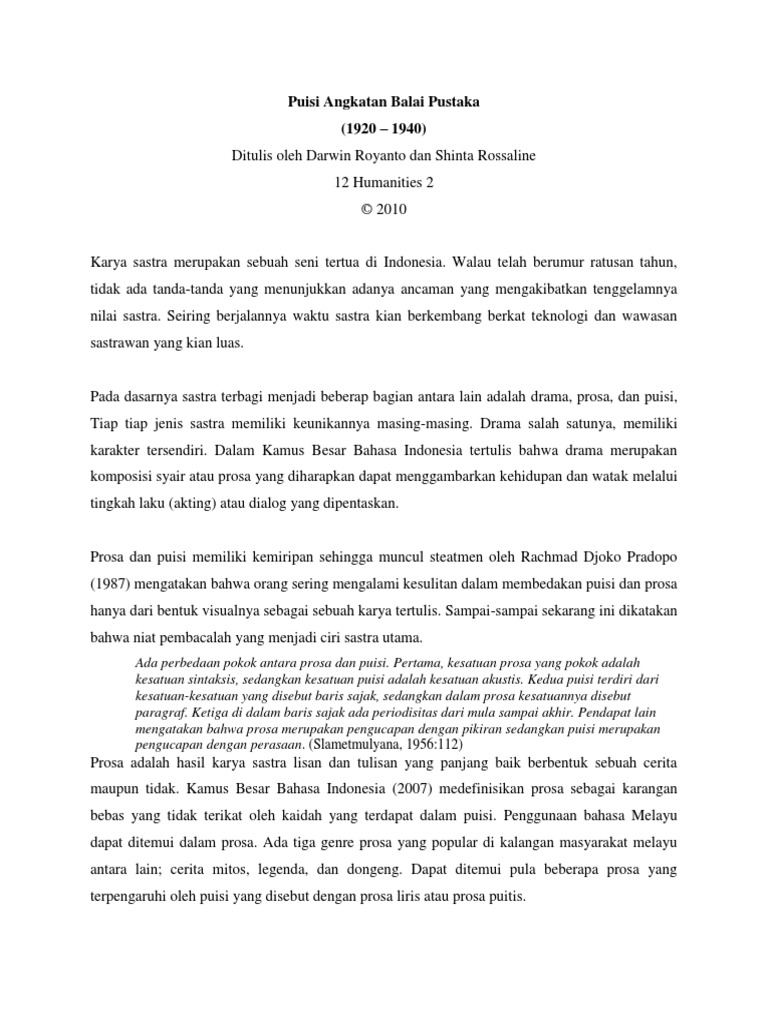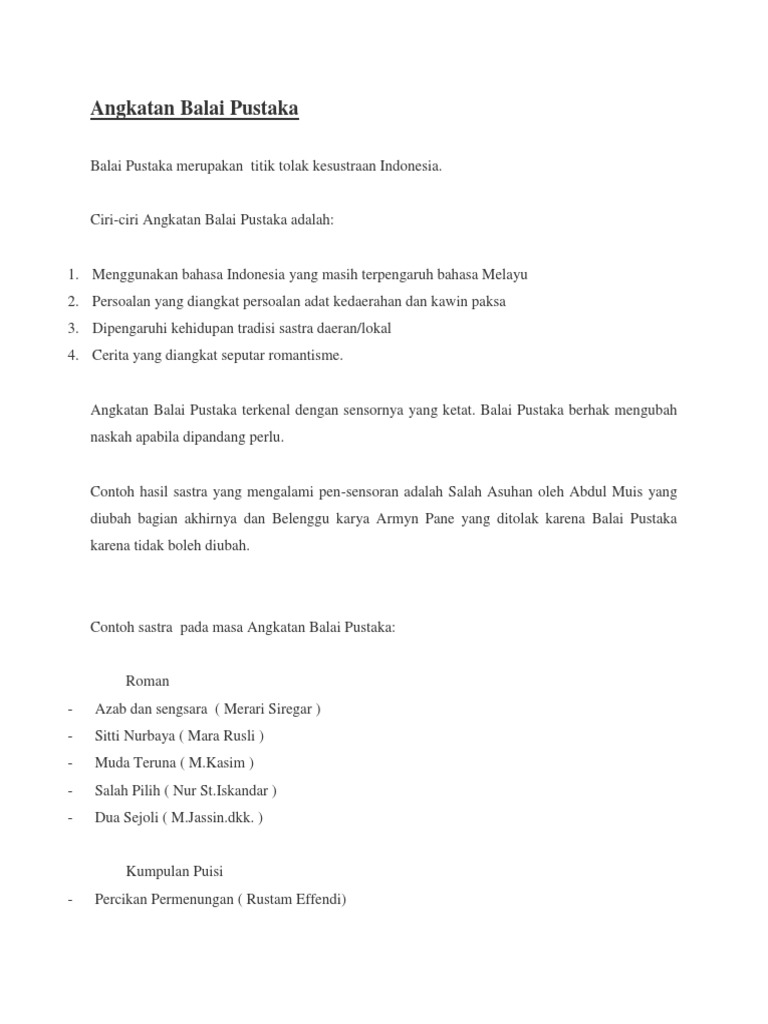 Bintang bintang yang serupa mestika berkilauan kilauan di langit tinggi sebagai kunang kunang di tempat yang gelap. Karya ini terdiri dari prosa roman cerita pendek novel dan drama dan puisi yang menggantikan syair pantun gurindam dan hikayat yang mungkin pada masa itu terlalu memberi pengaruh buruk banyak menyoroti kehidupan cabul dan dianggap memiliki misi politis. Puisi angkatan balai pustaka free download as word doc doc docx pdf file pdf text file txt or read online for free. Prosa roman novel cerita pendek dan drama dan puisi mulai menggantikan kedudukan syair pantun gurindam dan hikayat dalam khazanah sastra di indonesia pada masa ini. Novel siti nurbaya karya marah roesli novel azab dan sengsara karya merari siregar dan novel salah asuhan karya abdul muis merupakan salah satu contoh karya sastra angkatan balai pustaka. Angkatan balai pusataka merupakan karya sastra di indonesia yang terbit sejak tahun 1920 yang dikeluarkan oleh penerbit balai pustaka.