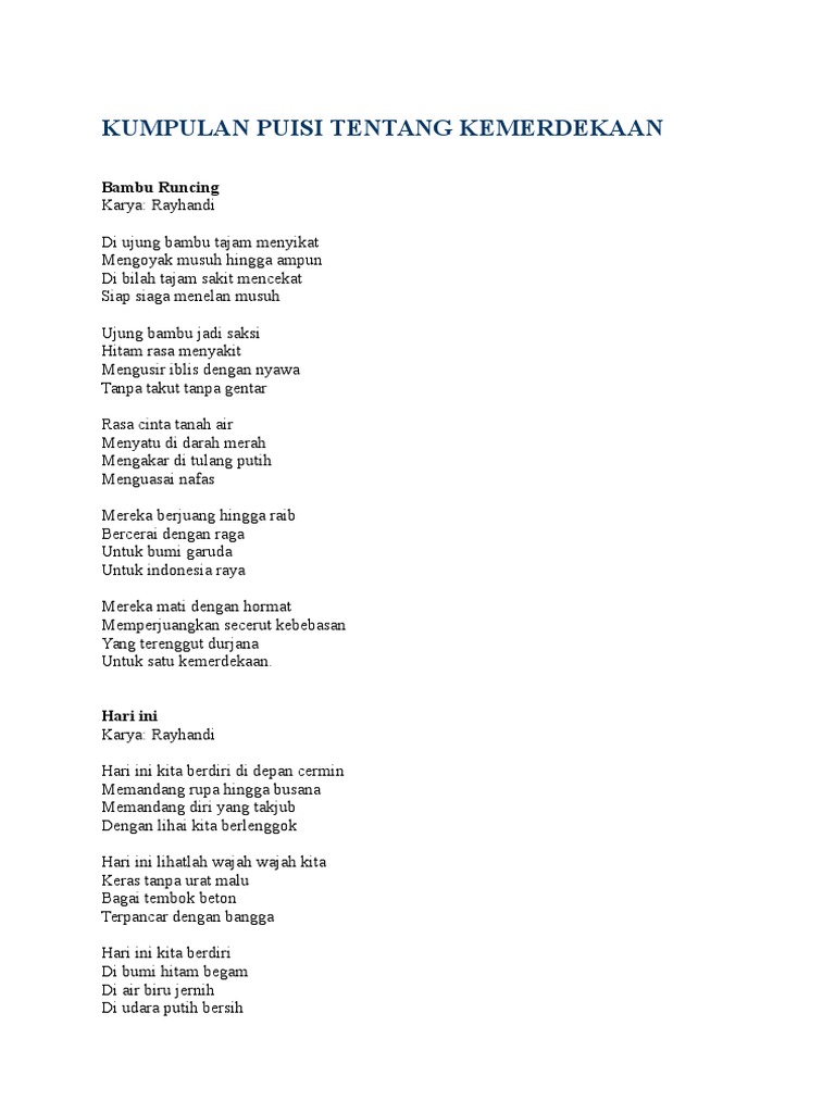 Contoh puisi cinta tanah air. Berikut ini adalah contoh puisi pendek bertemakan cinta tanah air dengan judul puisi lagu tanah airku. Analogi yang paling sederhana dari hal ini adalah kita kan menaati setiap perkataan dari orang yang kita cintai seperti halnya kita patuh kepada orang tua. Puisi cinta tanah air ini kupersembahkan untuk kita semua putra dan putri ibu pertiwi indonesiasemoga dengan secuil puisi ini mampu membangkitkan semangat nasionalisme yang kian tahun kian pudar menghilang entah kemanapenderitaan ketidak berdayaan dan tangisan ibu pertiwi kita akan penjajahan yang tidak langsung yang kita alami ini tak akan bisa terlepaskan oleh siapapun kecuali kita. Salah satu bentuk cinta tanah air dan untuk mengenang jasa para pahlawan yang telah gugur mendahului. Puisi tentang cinta tanah air. Hal itu bisa kita lakukan dengan menaati setiap peraturan yang berlaku.
