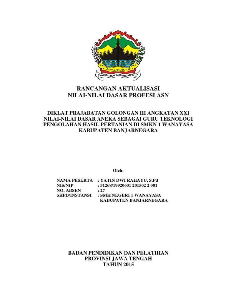 Tulis identitas yang jelas salah satu hal penting tapi banyak disepelekan. Contoh format rancangan aktualisasi prajabatan cpns di bpsdm selasa 05 maret 2019 1 comment edit aktualisasi adalah suatu kegiatan yang dilaksanakan di bpsdm badan pengembangan sumber daya manusia atau bpsdmd didaerah masing masing instansi. Penulis sadar bahwa rancangan laporan aktualisasi ini masih jauh dari kesempurnaan oleh karenanya penulis berharap masukan dari berbagai pihak membuat rancangan laporan menjadi lebih baik agar rancangan ini dapat dijadikan dasar dalam pelaksanaan dan pelaporan aktualisasi dan habituasi nilai nilai dasar asn serta memberikan manfaat yang sebesar besarnya bagi semua pihak yang membutuhkan. Guru sd smp sma contoh rancangan aktualisasi media pembelajaran.