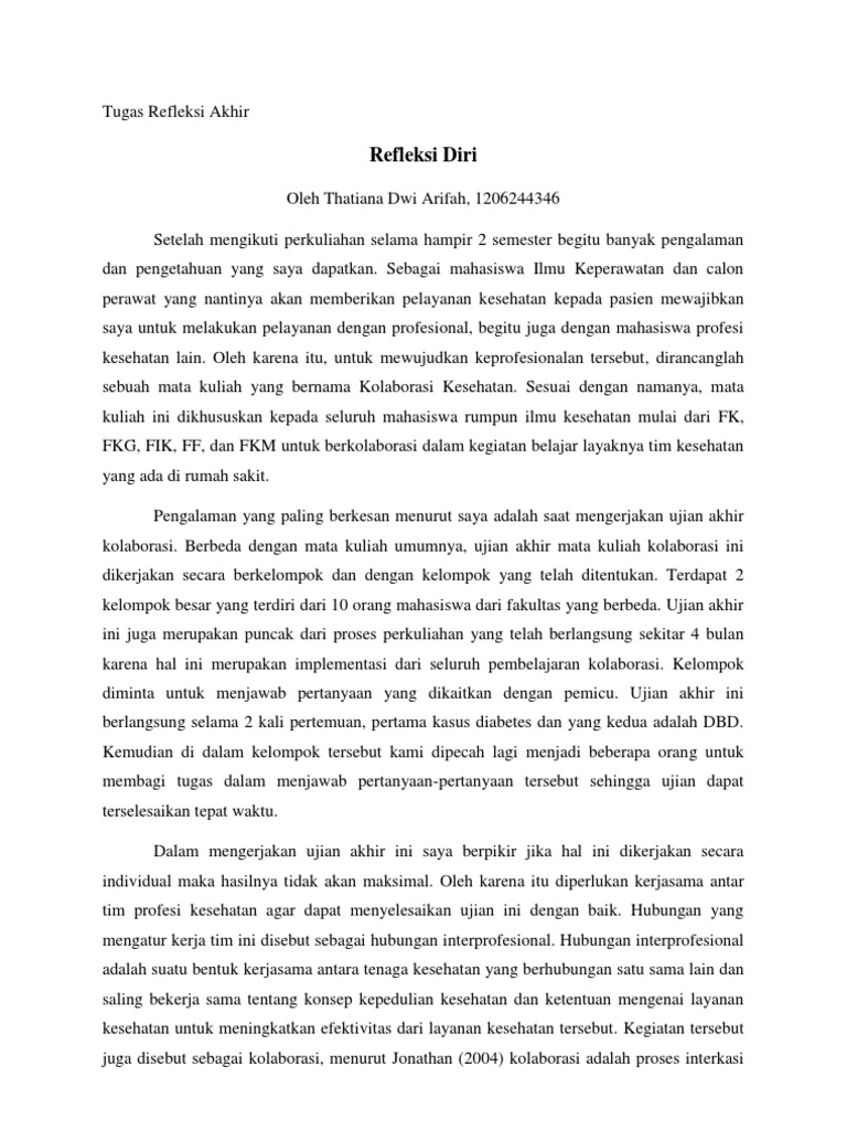 Ahmad khoiron nashirin nim1112103000079 tugas refleksi diri kekurangan diri saya dalam modul cellular and. Contoh refleksi diri ketika kegiatan ppl puji dan syukur saya panjatkan kehadhirat tuhan yang maha esa karena atas berkat dan rahmat nya saya dapat melaksanakan dan menyelesaikan ppl kumpulan rencana pelaksanaan pembelajaran atau modul dan laporan akhir ppl ini dengan baik dan tepat waktunya. Jumlah kata untuk refleksi diri awal ini berkisar antara 300 500 kata. Refleksi diri seorang mahasiswa. Refleksi diri sunday april 05 2015. Susanto zuhdi yang pada setiap perkuliahan selalu dengan piawai menyampaikan konsep konsep dalam ilmu sejarah.