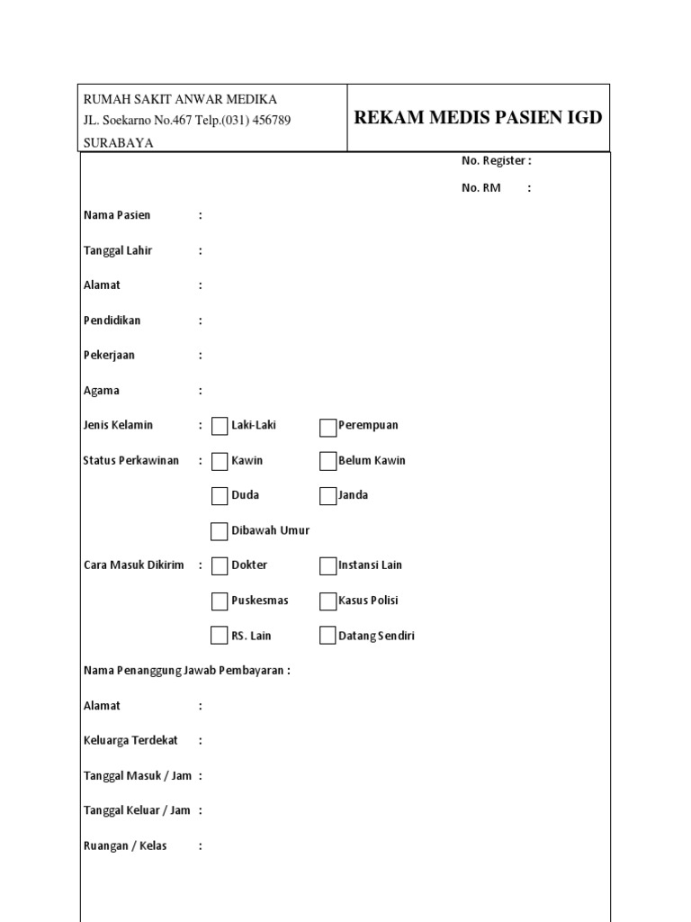 Family folder kartu tanda pengenal. Penyelenggaraan rekam medis pada suatu sarana pelayanan kesehatan merupakan salah satu indikator mutu pelayanan pada institusi tersebut. Contoh format lembaran rm 1. Berisi identitas pasien hasil anemnesis keluhan utama riwayat sekarang riwayat penyakit yang pernah diderita riwayat keluarga tentang penyakit yang mungkin diturungkan atau yang ditularkan diantara keluarga hasil pemeriksaan fisik laboratorium pemeriksaan kasus lainnya diagnostik karja dan pengobatan atau tindakan. Rekam medis untuk pasien rawat jalan termasuk pasien gawat darurat. Rekam medis di sarana pelayanan kesehatan primer puskesmas rekam medis di puskesmas merupakan salah satu sumber data penting yang nantinya akan diolah menjadi informasi.
