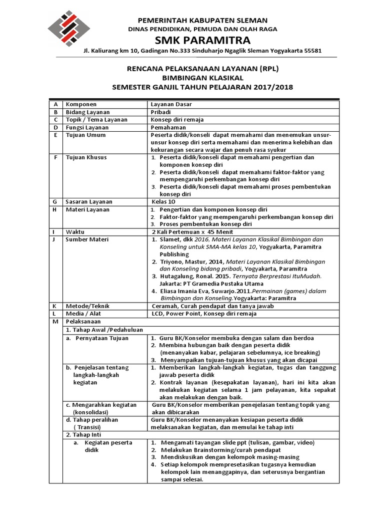 Contoh rpl bkp pop bk menumbuhkan rasa percayadiri. Kumpulan materi bk kurikulum 2013. Contoh rpl bimbingan klasikal guru bk rpl adalah rencana pelaksanan layanan guru bk hambatan konsentrasi pada umumnya terjadi karena perhatian bercabang terjadi pertentangan antara keinginan belajar dengan dorongan untuk melakukan pekerjaan yang laindengan menekan semua keinginan yang tidak berhubungan dengan belajar seseorang bisa berkonsentrasi dengan optimal. Contoh rencana pelaksanaan layanan rpl untuk bimbingan klasikal dengan tema cara berbicara yang baik. Contoh layanan bimbingan klasikal jasa pembuatan administrasi bpbk di sekolah dan ptkbk hubungi kami di 081222940294 wa.