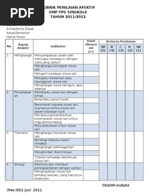 Contoh rubrik penilaian afektif. Pembelajaran afektif dan penilaian ranah afektif. Untuk selengkapnya kami akan memberikan contoh rubrik dan lembar penilaian sikap pengetahuan dan keterampilan dibawah ini. Rubrik penilaian sikap mapel ipa kd 31 menggali informasi dari teks laporan hasil pengamatan tentang gaya gerak energi panas bunyi dan cahaya dengan bantuan guru dan teman dalam bahasa indonesia lisan dan tulis dengan memilih dan memilah kosakata baku. Contoh pengukuran ranah penilaian afektif kompetensi siswa dalam ranah afektif yang perlu dinilai utamanya menyangkut sikap dan minat siswa dalam belajar. Instrumen dan rubrik penilaian ini saya sharingkan karena banyaknya permintaan dari rekan guru tentang bagaimana membuat penilaian sikap pengetahuan dan keterampilan dalam kurikulum 2013. Di bawah merupakan contoh rubrik penilaian ranah afektif atau sikap pada mata pelajaran biologi pada kegiatan praktikum pengamatan beberapa jenis jamur secara berkelompok mendiskusikan pengamatan jamur menuliskan hasil diskusi ke dalam laporan praktikum mempresentasikan hasil diskusi dan pengamatan mencakup aspek.