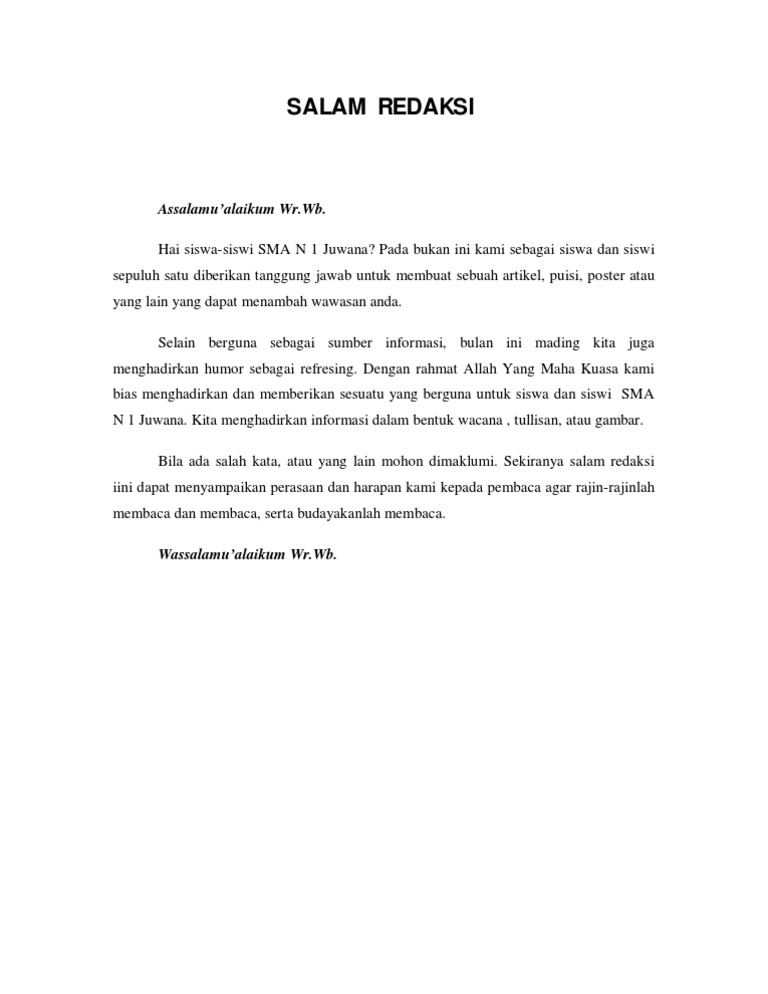 Salam redaksi merupakan sambutan atau sapaan dari penyusun kepada pembaca. Atas berkat rahmat allah yang maha kuasa dan berkat kerja keras wilwatikta crew akhirnya pada tahun 2015 ini majalah wilwatikta bisa terbit lagi. Kami juga ucapkan banyak terimakasih kepada semua anggota redaksi. Diterbitkan selasa mei 30 2017. Tinggalkan komentar batalkan balasan. Contoh salam redaksi majalah sekolah salam wilwatikta hello sahabat wilwatikta.