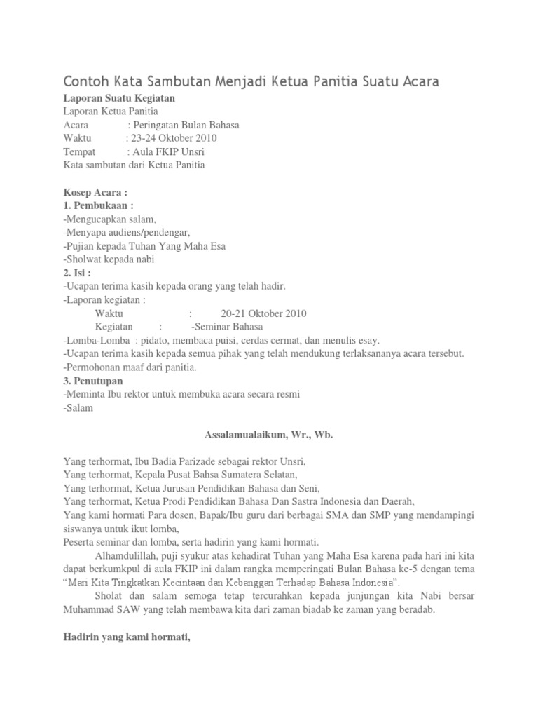 Contoh sambutan penutupan ketua panitia. Bismillahirrahmanirrahim yang terhormat dari dcc bandar lampung yang saya cintai. Contoh sambutan ketua panitia di setiap acara yang sedang kalian adakan pasti ada sambutan sambutannya begitu juga dengan sambutan ketua panitia yang menyelenggarakan jika anda baru pertama kali mengadakan acara dan harus mengisi sambutan sebagai ketua panitia tentu stres kecil nerves gugup dan lain sebagainya akan bercampur aduk. Kata sambutan ini kebiasaannya disampaikan oleh ketua panitia pada beberapa acara disebut dengan laporan ketua panitia ataupun dari kepala instansi ketua organisasi dan sebagainya. Contoh teks pidato sambutan dalam sesuatu kegiatan bisanya seorang ketua panitia penyelenggara kegiatan haruslah memberi pidato sambutan atau laporan ketua panitia yang disampaikan secara tertulis maupun secara lisan dalam menyambut suatu acara atau kegiatan yang akan dilaksanakan. Alhamdulillah puji syukur kita persembahkan kehadirat allah swt yang telah melimpahkan rahmat dan hidayah nya kepada kita sehingga pada hari ini berkesempatan hadir pada acara penutupan diklat arsiparis angkatan ii dan diklat administrasi pertanahan angkatan ii dan iii di lingkungan pemerintahan kota tasikmalaya tahun 2009. Kumpulan contoh kata sambutan dengan berbagai tema lengkap.
