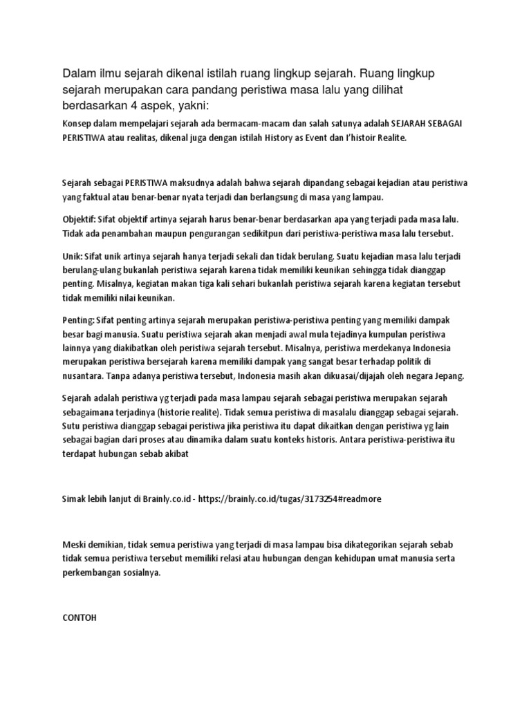 Dalam konteks sejarah sebagai peristiwa keberadaan sejarah ini memang ditempatkan pada suatu fakta kejadian ataupun hal yang benar benar terjadi di masa lampaudari kejadian kejadian tersebut akan diketahui apa alasan kejadian tersebut terjadi dan apa akibatnya. Contoh sejarah sebagai ilmu. Ali dalam ismaun menyatakan bahwa sejarah sebagai peristiwa adalah kejadian kenyataan aktualitas sejarah in concreto yang sebenarnya telah terjadi atau berlangsung pada waktu atau masa yang lampau. Sejarah sebagai peristiwa kisah ilmu dan seni. Banyak hal yang membuat indonesia menjadi kuat sampai saat ini salah satunya adalah sejarah bahwa kita pernah dijajah oleh bangsa lain. Sejarah itu gambaran masa lalu kalian sebagai individu maupun sebagai makhluk sosial.