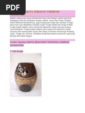 Berbeda dengan karya seni rupa 2 dimensi pada seni rupa 3 dimensi juga memiliki sisi panjang dan lebar ditambah dengan mempunyai ruang atau volume dalam karya seni jenis ini. Dari seni rupa dua dimensi seni murni dan. Berikut di bawah ini sudah kami siapkan 5 contoh seni rupa 3 dimensi. Berbagai contoh diatas dapat menjadikan kita lebih memahami apa itu seni rupa terapan 3 dimensi dan mengetahui perbedaan seni tersebut dengan seni seni lainnya termasuk seni murni yang menjadi dasar dari segala karya seni rupa yang telah diciptakan. Contoh seni rupa 3 dimensi. Berdasarkan fungsi serta manfaatnya seni rupa 3 dimensi sama halnya dengan cabang cabang seni lainnya dibagi menjadi dua yakni seni rupa murni 3 dimensi dan seni rupa terapan 3 dimensi.