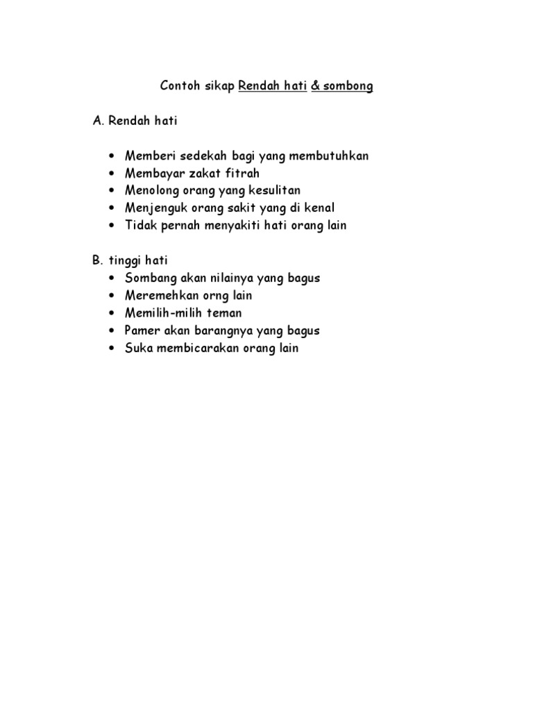 Contoh sikap rendah hati. Salah satu sikap yang menunjukan sifat positif seseorang ialah rendah hati. 5 alasan penting mengapa sikap rendah hati perlu dimiliki setiap pemimpin pemimpin paling efektif adalah mereka yang memiliki sikap rendah hati dan tidak sombong dengan setiap pencapaian dan prestasi yang mereka dapatkan. Andra adalah siswa yang pintar namun ia tidak pernah sombong akan kepintarannya. Contoh kerendahan hati seseorang. Contoh sikap rendah hati ini ciri cirinya ciri ciri rendah hati 9 ciri sikap rendah hati yang dimiliki seseorang kerendahan hati adalah cerminan dari sikap dewasa orang yang memiliki sikap rendah hati tidaklah merasa sombong dan angkuh dengan kelebihan yang dimilikinya justru ia cukup cerdas untuk menutupi kelebihannya dan mengakui kekurangannya. Contoh sikap rendah hati sombong a.