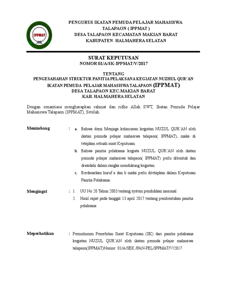 Contoh sk kepanitiaan kegiatan. Contoh sk ketiap kegiatan yang berkaitan dengan keuangan berikut ini adalah contoh sk keuangtan untuk setiap kegiatan pada sd dan smp negeri. Besar honor rp ket. Kumpulan contoh surat keputusan sk kepala sekolah lengkap administrasi sekolah sk kepala sekolah surat keputusan atau yang biasa lebih dikenal dengan sk merupakan sebuah surat pernyataan yang dikeluarkan oleh lembaga tertentu formal maupun non formal yang berisi suatu kebijakan atau keputusan tertentu yang berhubungan dengan lembaga tersebut. Bahwa pembentukan kepanitian dalm kegiatan latihan dasar kepemimpinan ldk merupankan suatu keharusan yuridis formal dalam organisasi. Menyusun dan membuat surat keputusan sebagai dasar kegiatan mpls 20182019. Minggu 23 februari 2020 tambah komentar edit.