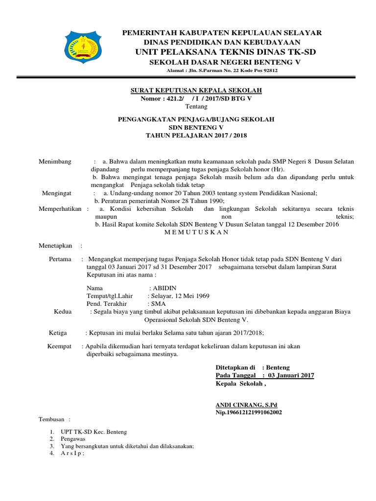 Contoh sk penjaga sekolah. Dalam mengangkat suatu jabatan atau tugas tertentu harus disertakan dengan sk surat keputusan kepala sekolah tentang pengangkatan dan penugasan untuk jabatan tersebut. Smkn 1 sajingan besar melalui osis mengadakan kunjungan ke smkn 1 teluk keramat dalam lawatan kunjungan tersebut juga dilaksanakan kegiatan pertandingan olah raga persahabatan. Sepak bola 1 4 volly putra 2 3 volly putri 3 1 fotodok sepak takraw 3 2 serta dilaksanakan malam pentas seni seni tari dayak seni tari melayu yang diikuti dan disaksikan oleh seluruh guru dan siswa kedua. Contoh sk petugas kebersihan penjaga sekolah sd smp sma terbaru ini merupakan salasatu surat keputusan kepala sekolah berkenaan dengan pengangkatan dan penugasan suatu jabatan. Abahwa dalam meningkatkan mutu keamanaan sekolah pada smp negeri 8 dusun selatan dipandang perlu memperpanjang tugas penjaga sekolah honor hr. Contoh sk kepala sekolahmadrasah ini merupakan format terbaru yang dapat anda.
