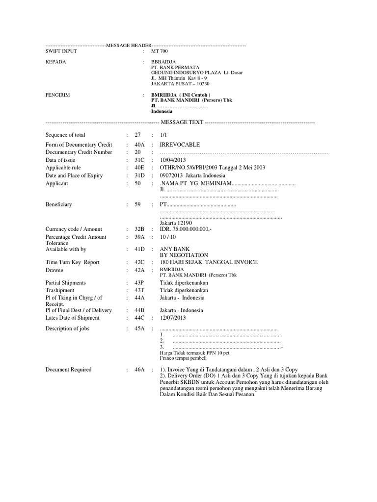 Contoh skbdn bank mandiri. Bank besar di indonesia seperti bank mandiri dapat melayani kebutuhan baik dari sisi pembeli buyer maupun penjual seller. Cuatomer saya juga menggunakan sistem pembayaran scf bank mandiri utk tagihan di atas 20 jutayg jadi kendala bagi saya sbg muslim adalah scf tsb termasuk transaksi ribawi ketika kita cairkan sebelum tanggal jatuh tempo sedangkan klo harus nunggu jatuh tempo bisa bisa cash flow collaps karena harus nunggu hampir 3 bulanserba salah mau gk mau harus dtinggalkan atau cari customer lain klo. Bab 17 surat kredit berdokumen dalam negeri skbdn amanitanovi at unyacid 166 4. Informasi keuangan berita dan saham bank mandiri bagi pemegang saham dan investor secara efektif efisien dan transparan. Surat kredit berdokumen dalam negeri skbdn atau yang sering disebut dengan lc lokal adalah janji tertulis dan tidak dapat dibatalkan irrevocable yang diterbitkan oleh bank pembuka issuing bank atas instruksi dari pemohon applicant untuk membayar sejumlah uang kepada penerima beneficiary sepanjang syarat dan kondisi yang tercantum di dalam skbdn terpenuhi. Sekarang ada cara yang lebih cepat dalam menerbitkan skbdn yaitu dengan menggunakan dana nasabah baik berupa dana tunaiblokir rekeningblokir deposito sebagai setoran jaminan.