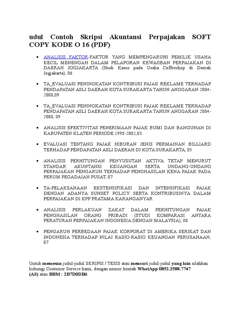 Seperti yang kita tahu bahwasnya jurusan akuntansi termasuk salah satu jurusan yang menuntut ketelitian tingkat tinggi karena anda berhubungan dengan angka angka yang akan gunakan untuk menghitung atau menginput data sehingga jika misalnya anda salah dalam menulis 1 angka maka tentu saja hasilnya pun akan berubah. Contoh skripsi akuntansi keuangan. Sehingga yang membutuhkan banyak referensi atau skripsi akuntansi yang sudah jadi dan komplit akan dapat. Contoh judul skripsi akuntansi sebanyak 259 berikut ini telah kami siapkan masing masing file nya secara lengkap mulai dari kata pengantar bab i pendahuluan bab ii kajian pustaka bab iii metode penelitian bab iv pembahasan bab v kesimpulan dan saran sampai daftar pustaka.