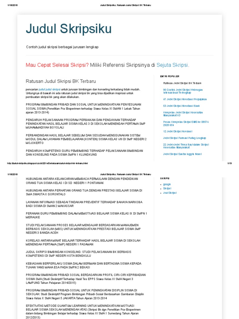 Untungnya di bawah ini ada ratusan judul skripsi bk yang bisa dijadikan inspirasi untuk pembuatan skripsi bk yang akan dilakukan. Perbedaan kemandirian antara anak sulung dengan anak bungsu pada siswa kelas ii sma negeri 11 semarang tahun pelajaran 20042005. Skripsi yuk adalah jasa pembuatan skripsi jurusan bk psikologi dan bimbingan yang berlokasi di jawa timur. Kumpulan judul contoh skripsi bimbingan konseling. Kirimkan ini lewat email blogthis. Judul harus simple jelas dan tak bertele tele.