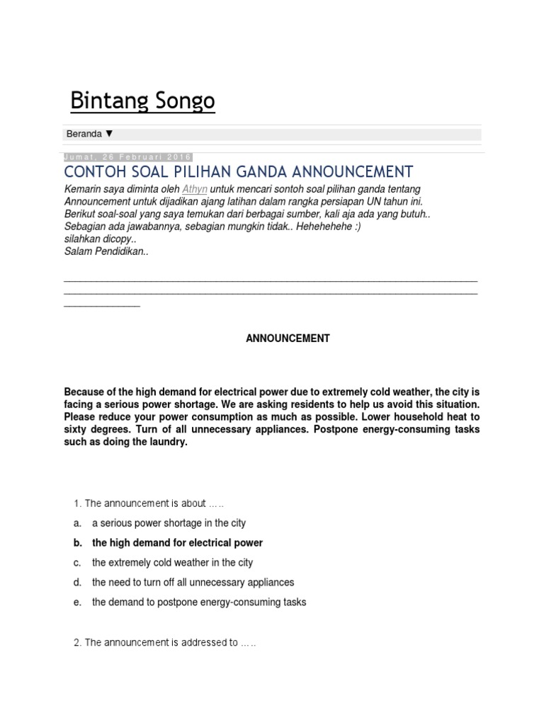 Contoh soal announcement pilihan ganda beserta jawabannya. Download contoh 20 pilihan ganda soal beserta jawabannya bahasa inggris tentang. We are announcing today that we are bringing the milestone and ever green brands even closer together. Materi ini bertujuan untuk berlatih contoh soal bahasa inggris announcement kelas 1 sma beserta jawabannya yang menggunakan kosakata bahasa inggris di lingkungan sekolah. I will visit your hometown. Dalam artikel ini saya akan membagikan 10 contoh soal announcement text dan kunci jawaban terbaru untuk pelajar sekolah menengah pertama kelas 7 8 atau 9 smpmts. Contoh soal announcement sma pilihan ganda beserta jawabannya the following text is for questions 1 and 2.