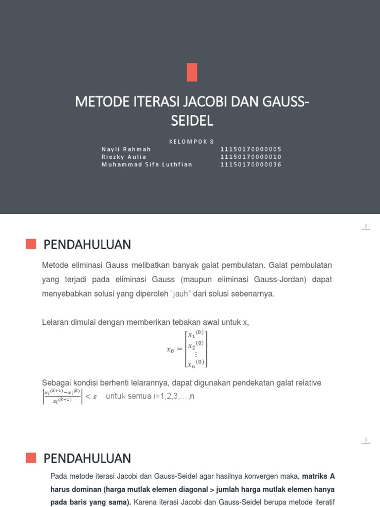 Selesaikan sisitem persamaan berikut dengan metode jacobi. Dengan metode iterasi gauss seidel sesatan pembulatan dapat diperkecil karena dapat meneruskan iterasi sampai solusinya seteliti mungkin sesuai dengan batas sesatan yang diperbolehkan. Pengertianeliminasi gauss seidel adalah metode yang menggunakan proses iterasi hinggadiperoleh nilai nilai yang berubahbila diketahui persamaan linier simultana11 x1 a12 x 2 a1n x n b1a 21 x1 a 22 x 2 a 2 n x n b2 a n1 x1 a n 2 x 2 a nn x n bnberikan nilai awal dari setiap xi i 1 n kemudian sistem persamaan liniertersebut akan menjadi. Met num02 persamaan non linier. Cara membuat menu category di sidebar pada wordpress. Perbandingan metode iterasi jacobi dan iterasi gauss seidel dalam penyelesaian sistem persamaan linier disusun sebagai salah satu syarat untuk memperoleh gelar sarjana sains s si di universitas lampung.