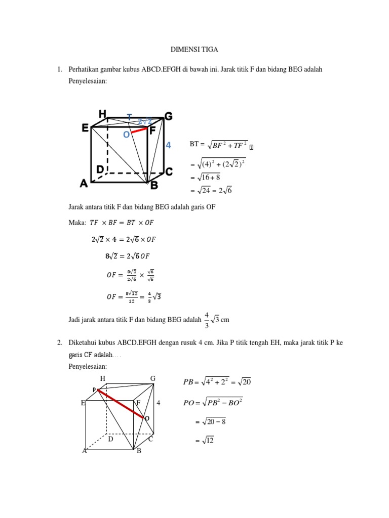 Tentukan a panjang diagonal bidang sisi kubus. Contoh soal bab dimensi tiga geometri ruang dengan pembahasan lengkapnya simak disini. Contoh soal dan pembahasan tentang jarak antara titik dengan bidang. Contoh soal dan pembahasan tentang dimensi tiga. Pembahasan soal ujian nasional un matematika ipa jenjang pendidikan sma untuk pokok bahasan dimensi tiga yang meliputi jarak atau sudut antara titik garis dan bidang. Pada postingan ini kita membahas contoh soal jarak titik ke garis jarak titik ke bidang dimensi tiga kubus dan limas yang disertai dengan penyelesaiannya atau pembahasannya.