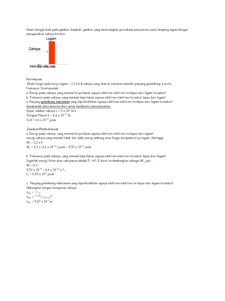 Contoh soal efek fotolistrik sebuah logam natrium disorot dengan cahaya yang memiliki panjang gelombang 200 nm. Efek fotolistrik yaitu terlepasnya elektron dari permukaan logam karena logam tersebut disinari cahaya. Hubungan energi kinetik elektron dan frekuensi penyinaran pada gejala foto listrik terlihat pada grafik di bawah ini. Percobaan yang dilakukan. Peristiwa efek fotolistrik dapat dijelaskan melalui mekanika klasik c. Sebuah atom memiliki tingkat tenaga eksitasi 2 ev di atas tingkat dasarnya.