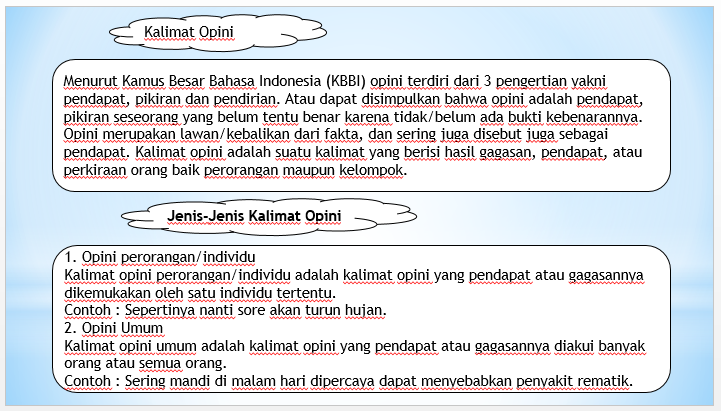 Saat ini doni duduk di kelas 3 smp negeri 1 semarang. Demikianlah tentang pengertian jenis ciri ciri kalimat fakta dan opini beserta contohnya. Contoh kalimat fakta khusus. Fakta dan opini merupakan dua istilah yang sudah cukup umum digunakan. Sebenarnya materi ini adalah materi yang tidak terlalu sulit hanya dibutuhkan sedikit keseriusan dalam menganalisa kalimat saja. Terhambatnya penurunan tinggi air di ruas jalan tenggelis kemungkinan disebabkan oleh tersumbatnya air.