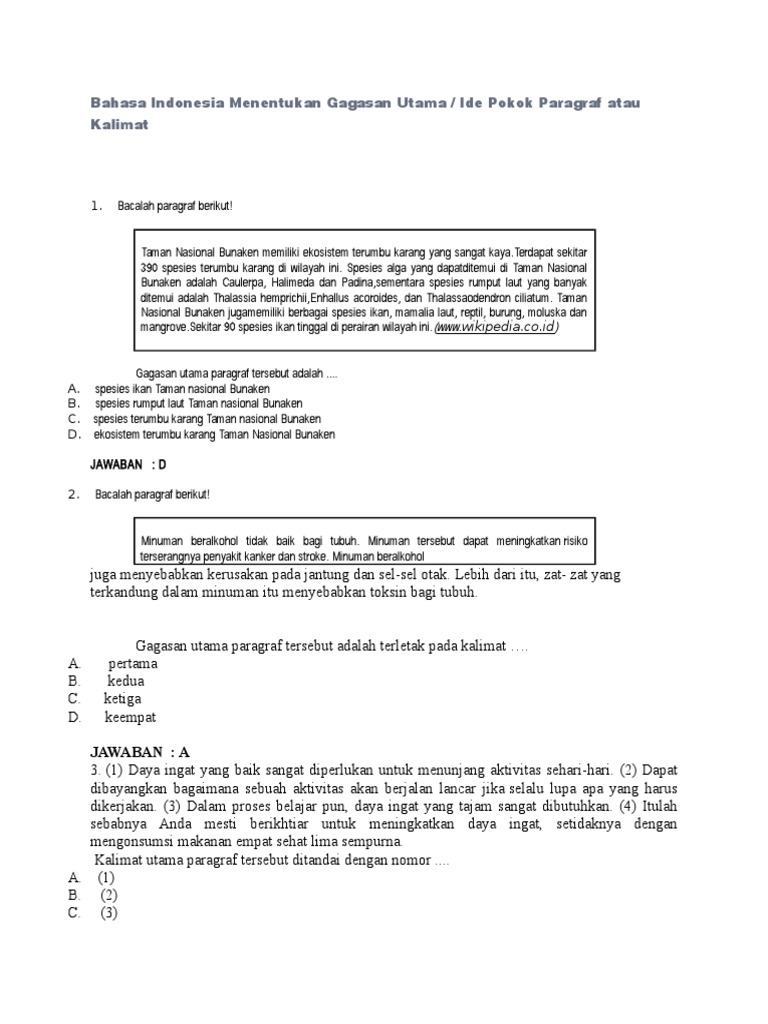 Contoh soal gagasan pokok. Tema ini kemudian dikembangkan melalui kalimat kalimat pendukung. Selalu berhemat energi materi. Kalimat yang mengandung gagasan pokok merupakan kalimat utama. Menentukan gagasan utama merupakan salah satu soal yang bisa dibilang wajib tampil di soal un mata pelajaran bahasa indonesia. A demikianlah yang dapat admin bagikan tentang contoh soal gagasan utama kalimat utama dan simpulan teks dalam ujian nasional bahasa indonesia. Jadi jawaban tepat terdapat pada pilihan jawaban a.