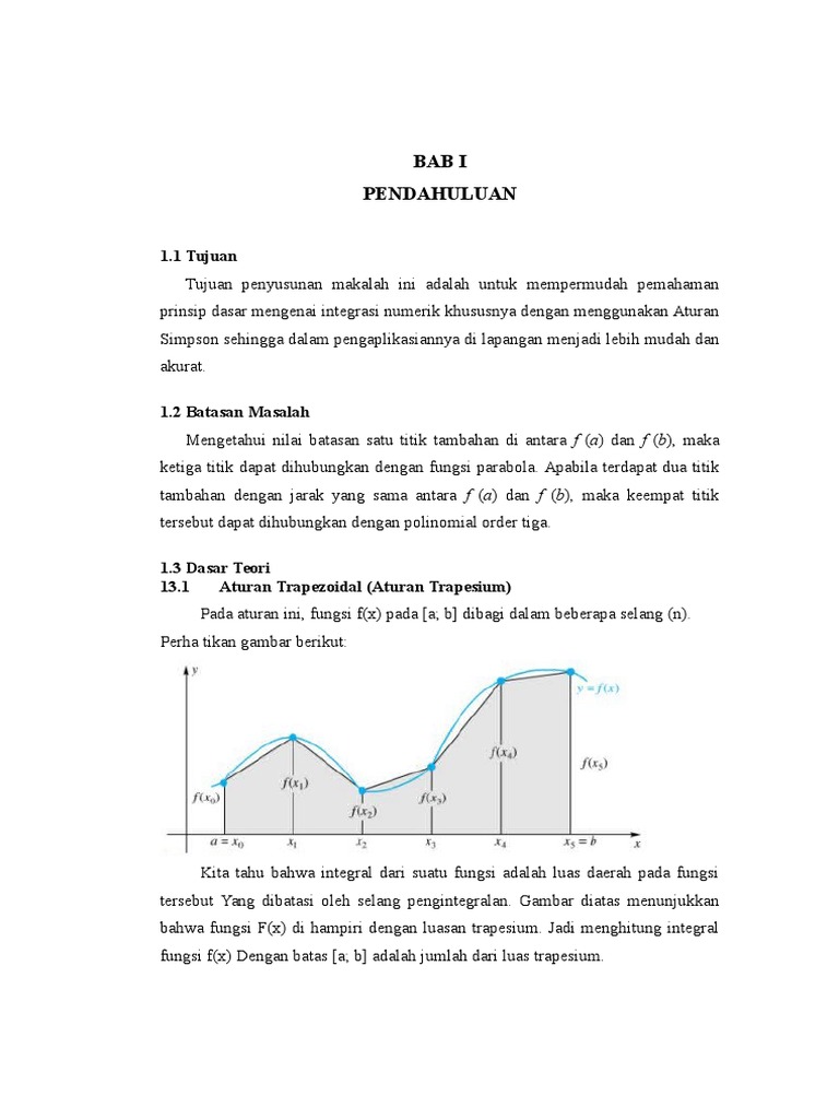 Diilustrasikan kedalam grafik ayng terdapat pada buku computer. Integrasi numerik metode simpson adalah metode yang digunakan dengan mem fitting persamaan quadratik kedalam tiga point yang melalui fx untuk mengetahui luas area yang berada di bawahnya. Integrasi numerik metode trapezoid dan metode simpson 13. Integral numerik metode trapezoid dan metode simpson posted on june 12 2012 december 16 2016 by rizkipprastio in fisika komputasi integral numerik juga dinamakan quadrature telah menjadi perhatian para ilmuwan sejak abad 18 hingga 19. Metode integrasi numerik adalah suatu cara untuk menghitung aproksimasi luas daerah di bawah fungsi yang dimaksud pada selang yang diberikan. Dalam gambar 32 metode terbuka digunakan untuk mendekati integral fungsi dengan memilih batas bawah integrasi x x 1 dan batas atas xxn1.