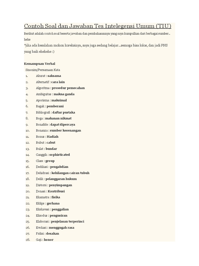 Soal tes intelegensi umum cpns tes intelegensi umum merupakan salah satu bentuk tes psikologi yang dapat mengungkap apa yang telah dicapai seseorang secara intelektual. Contoh soal dan jawaban tes intelegensi umum tiu berikut adalah contoh soal beserta jawaban dan pembahasannya yang saya kumpulkan dari berbagai sumber. Upayakan bisa mencapai 80 benar. Prosedur pendaftaran cpns 2018 melalui website sscnbkngoid secara online. Selain tiu akan terdapat 2 macam tes lagi yang diujikan dalam tes seleksi kompetensi dasar. Hehe jika ada kesalahan mohon koreksinya saya juga sedang belajarsemoga bisa lolos dan jadi pns yang baik ehehehe kemampuan verbal sinonimpersamaan kata 1.
