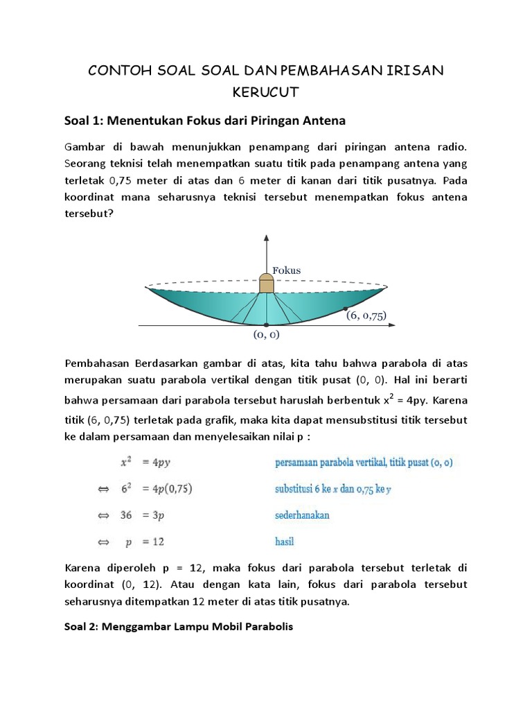 Contoh soal dalam irisan kerucut parabola. Irisan kerucut adalah tempat kedudukan titik titik pada bidang yang perbandingan jaraknya terhadap suatu titik dan suatu garis selalu tetap. Pada kesempatan kali ini akan dibahas tentang contoh soal persamaan parabola dan penyelesaiannya yang merupakan bagian dari irisan kerucut parabola kelas xi. Volume kerucut 13 π r2 t. Contoh soal dan pembahasan dari bank soal quipper tentang irisan kerucut pada parabola. Soal soal kerucut dan pembahasannya.