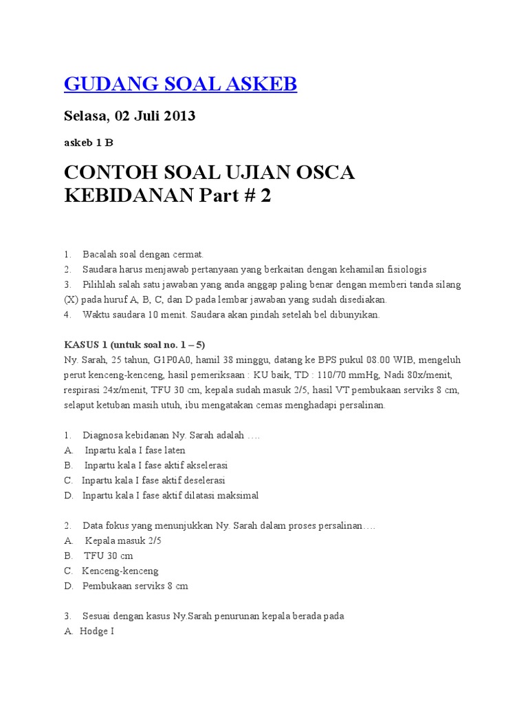Contoh soal kasus kebidanan beserta jawabannya. Contoh soal kasus kebidanan stasi 1. Di bawah ini di agnosa yang tepat untuk. Contoh soal kasus fisiologi kebidanan beserta jawabannya. Seseorang ibu hamil dengan usia kandungan 30 minggu dengan riwayat g6 p3 a2 datang. Tantangan yang muncul menjadi siapakah bidan menghadapi persoalan persoalan terkait dengan etika dan. Contoh soal untuk uji kompetensi bidan 1 asuhan kebidanan ibu nifas dan menyusui 1 1.
