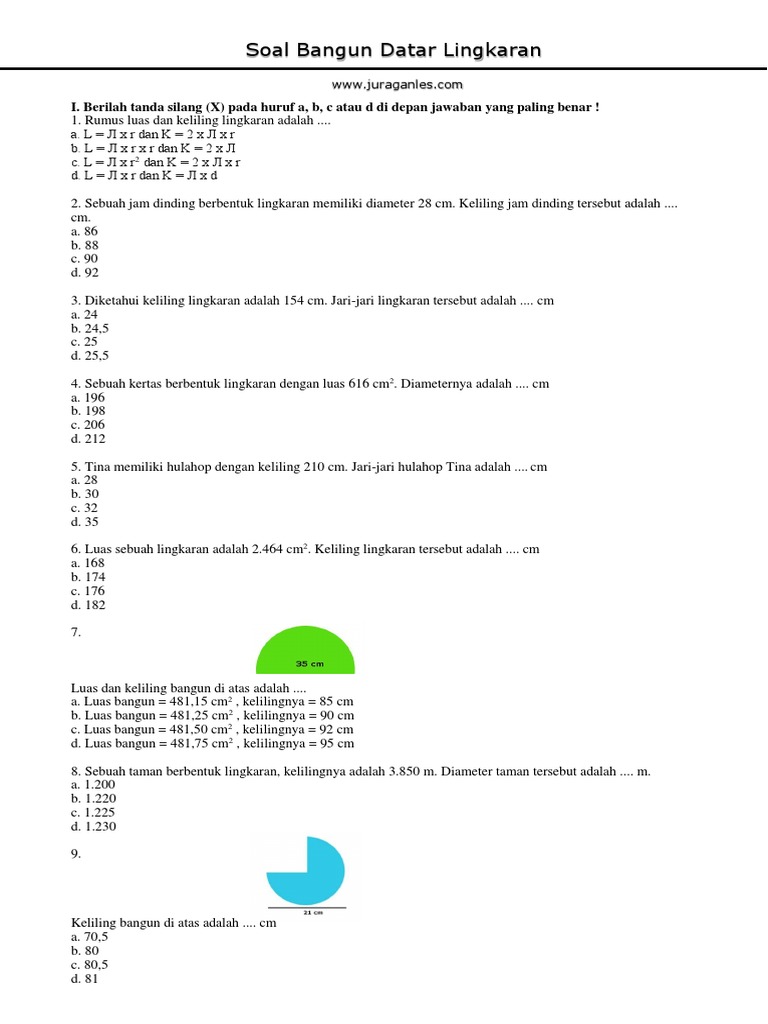 Contoh soal keliling dan luas lingkaran sd 1 memuat kumpulan soal materi lingkaran tingkat sd untuk level kognitif pengetahuan dan pemahaman. Soal luas dan keliling lingkaran ini terdiri dari 20 soal pilihan ganda dan 10 soal uraian.