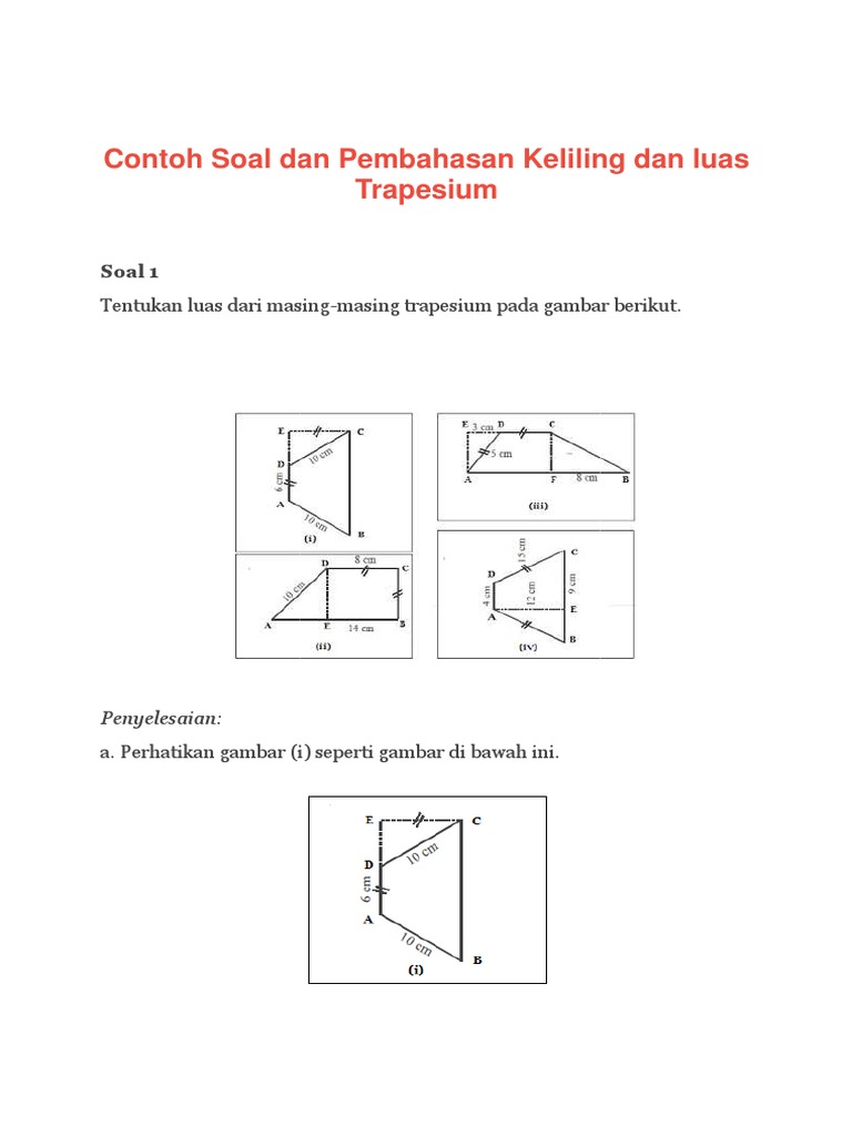 Rumus trapesium pada ulasan kali ini kita akan mencoba membahas tentang bagaimana cara menghitung luas trapesium dan contoh soal lengkap mengenai perhitungan luas dan keliling trapesium disertai jawaban pembahasannya secara detail. Jika sebuah trapezium yang mempunyai panjang sisi yang sejajar berturut turut yaitu 4 cm dan 10 cm serta tinggi 5 cmcari dan hitunglah luas trapezium tersebut. Luas trapesium l ½ x jumlah sisi yang sejajar x tinggi. Contoh soal luas trapesium. Contoh contoh ini bisa digunakan sebagai bahan belajar yang mudah. Berikut adalah contoh contoh menghitung luas dan keliling trapesium serta pembahasannya.