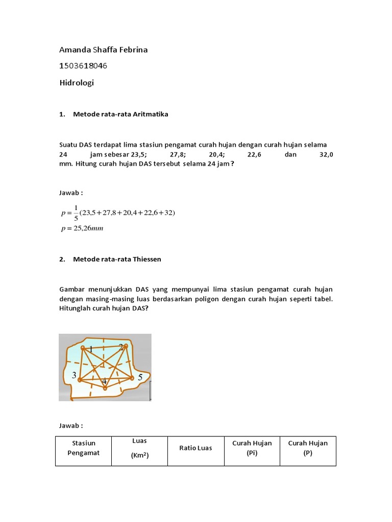 Contoh soal menghitung curah hujan. P curah hujan rata rata p 1p 2p n besaran curah hujan yang sama pada setiap garis isohyet. Contoh kasusnya seperti ini jika anda ingin mengetahui intensitas curah hujan dari data curah hujan harian selama 5 menit pengerjaannya adalah sebagai berikut jika diketahui curah hujan selama satu hari bernilai 56 mmhari. Contoh soal 1 soal. Cara rata rata aritmatik cara rata rata aritamatik adalah cara yang paling mudah diantara cara lainnya p oligon dan isohet. Untuk menghitung hujan rencana dengan rumus mononobe harus tersedia data hujan harian. Rumus menghitung volume aliran debit.