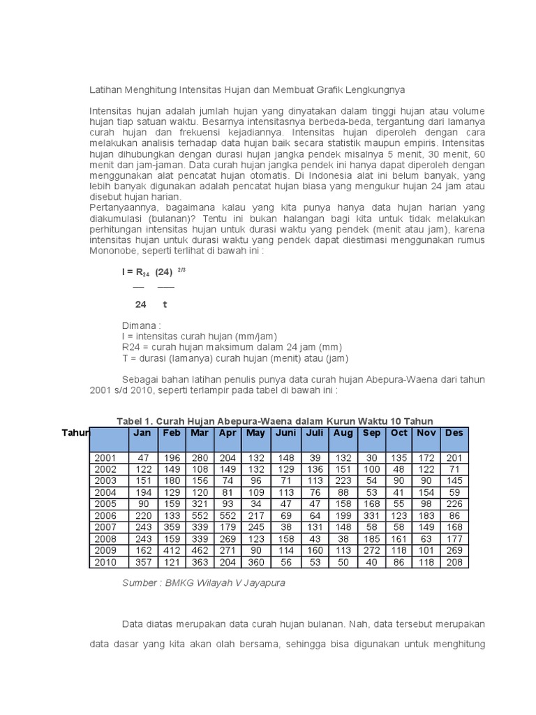 Serta menentukan dengan berapa jumlah stasiun dan metode apakah yang menghasilkan nilai korelasi yang baik. Curah hujan mm januari. Digunakan khususnya untuk daerah seragam dengan variasi ch kecil. Dengan mengubah variabel t untuk masing masing curah hujan r24 untuk periode ulang 2 tahun r24 152805 mmjam untuk periode ulang 5 tahun dan r24 171080 mmjam untuk periode ulang 10 tahun maka hasilnya adalah sebagai. Data curah hujan di kota z. Bentuk umum dari rumus mononobe adalah.