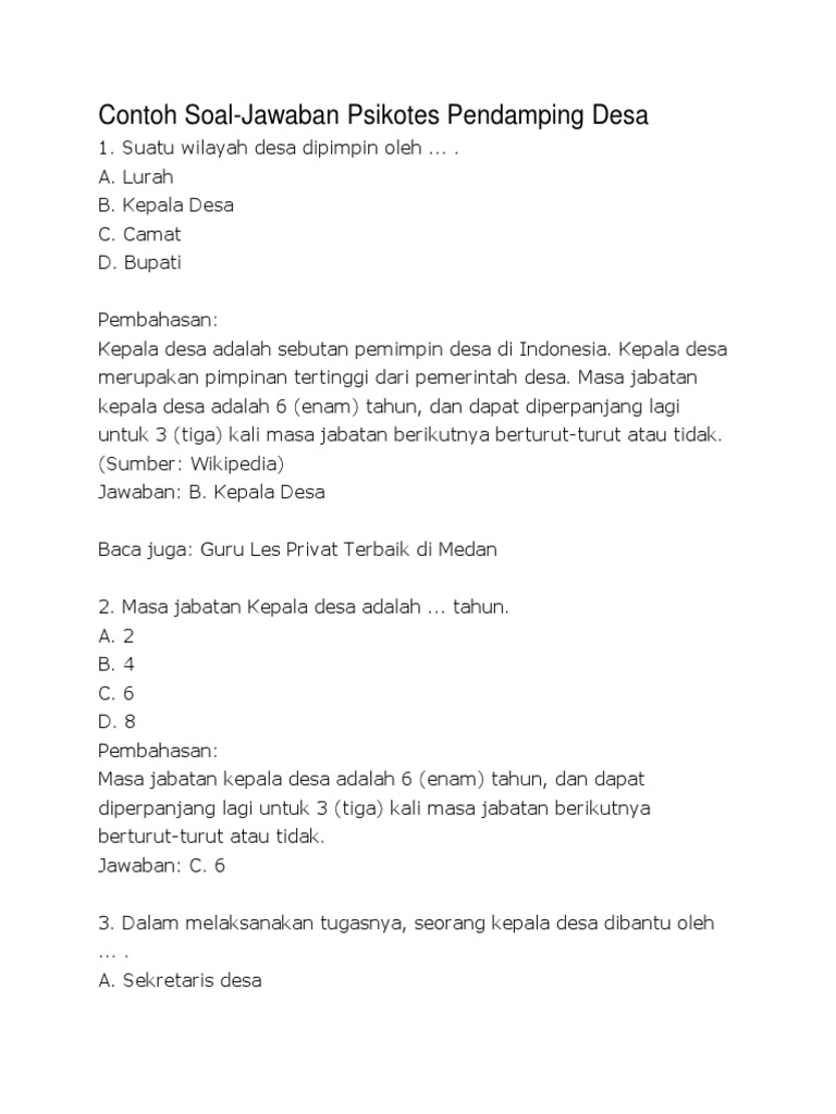 Contoh soal pendamping desa. Pada versi gratis ini saya sediakan soal latihan ujian perangkat desa yang berkaitan dengan peraturan daerah dan peraturan desa. Contoh simulasi soal ujian pendamping desa diterbitkan 0316. 2 latihan soal ujian perangkat desa beserta pembahasannya. Contoh soal tes tertulis dan psikotes pendamping desa 2016 download pdf soal pendamping desa bagi anda yang sudah melakukan pendaftaran online pendamping desa tahun 2016 mungkin tinggal menunggu jadwal pelaksanaan tes tertulis dan psikotes yang nanti akan diberitahukan lebih lanjut oleh panitia seleksi provinsi masing masing. Untuk versi lengkap soal tertulis dan soal praktik kami telah menyediakan kursus online yang dapat dikerjakan kapan saja dan dimana saja. Ke 10 soal simulasi berikut ini bukan soal resmi dari kementerian desa pembangunan daerah tertinggal dan transmigrasi.