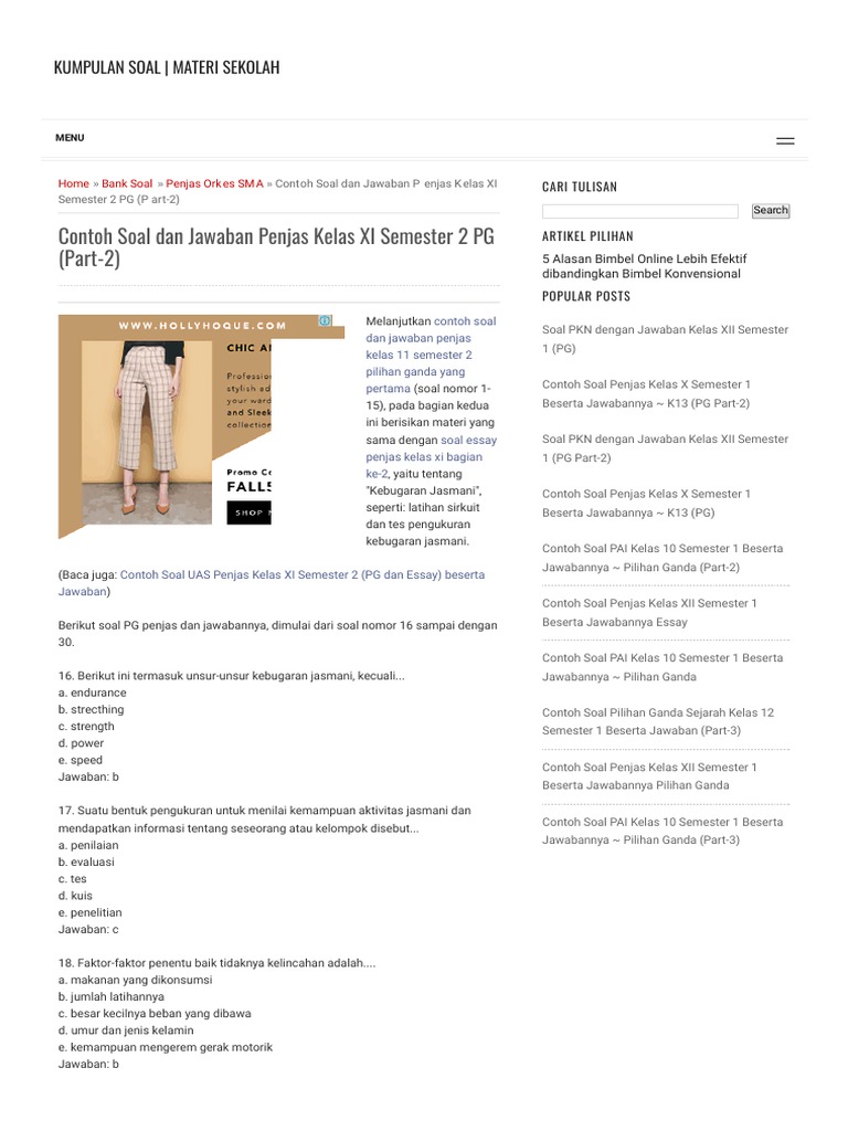 Contoh soal penjaskes kelas 10 semester 2 beserta jawabannya. Berikut ini adalah rincian soal essay penjaskes kelas 10 smama semester 2. Pekerjaan berikut dapat dilakukan di laboratorium. Pertanyaan pjok pts ini telah diberikan kunci jawaban. Jumlah berikut termasuk jumlah nominal adalah a. Melakukan awalan dengan langkah ancang ancang lebar merupakan salah satu cara melakukan. Untuk materi yang sama tetapi dalam bentuk essay bisa anda baca pada contoh soal penjas kelas x semester 2 dan kunci jawabannya bagian pertama dalam bentuk essay.